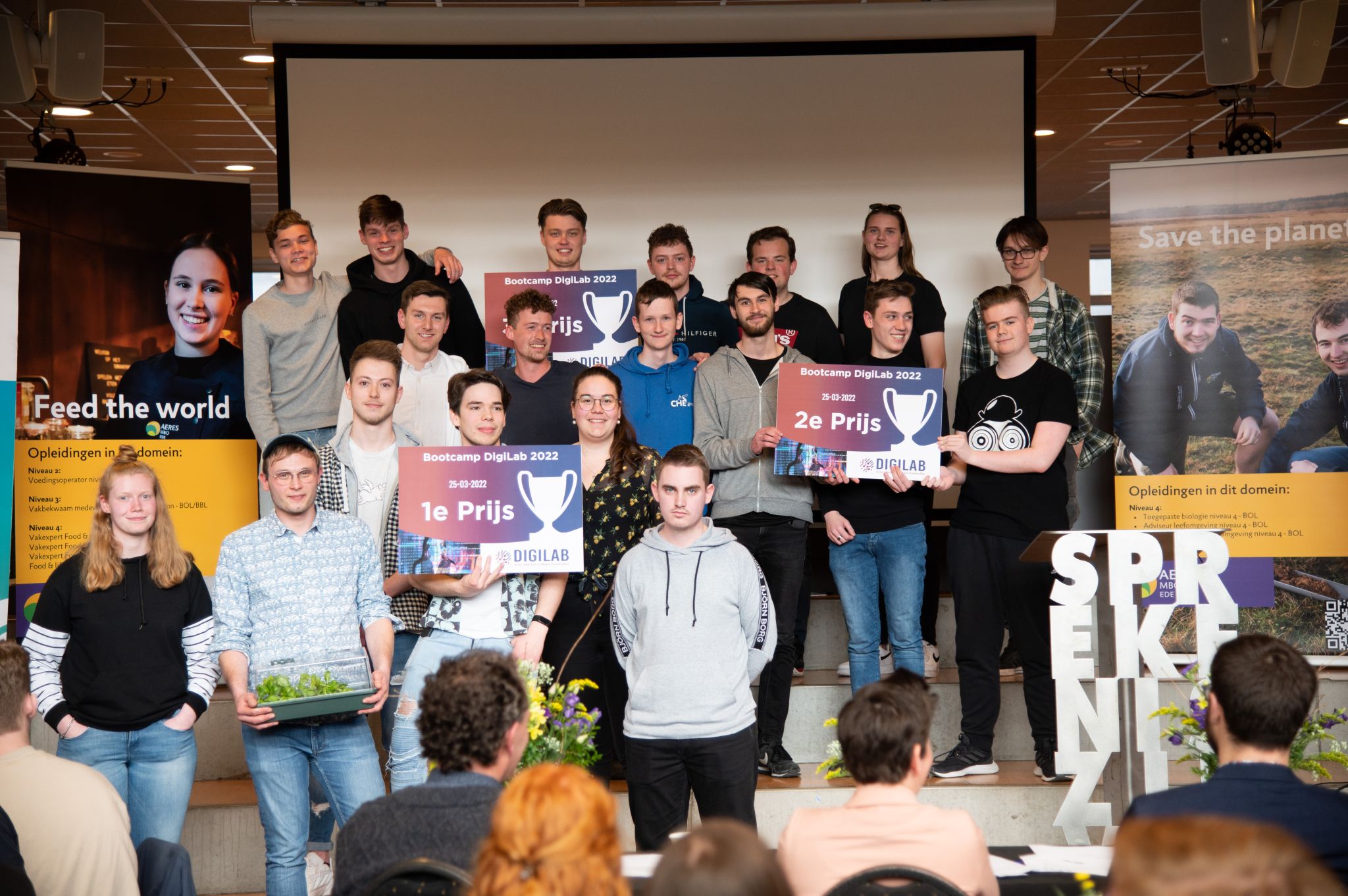 Van 23 tot en met 25 maart vond de Bootcamp DigiLab 2022 op de Kenniscampus in Ede plaats. Vrijdagmiddag werd het event afgesloten met een bruisende finale in de ontvangsthal van Aeres vmbo. Tijdens dit initiatief zetten 125 mbo- en hbo-studenten de resultaten van de Hackathon die op 25 februari plaatsvond om naar prototypes, praktische businessplannen en marketingstrategieën. De studenten werkten in gemixte teams, onder leiding van docenten en experts uit het bedrijfsleven, aan vraagstukken over vertical farming van de startup FarmVent. Team 17 nam de 1e prijs in ontvangst. Zij bedachten een innovatieve toegankelijke app, welke gekoppeld is aan diverse meet- en fotosensoren, waardoor data van de planten altijd en overal inzichtelijk zijn, zodat er tijdig op geacteerd kan worden. In het online dashboard zijn uitlegvideo’s beschikbaar, die gebruikers informeren hoe ze optimaal de planten kunnen monitoren, verzorgen, oogsten en hoe er bijvoorbeeld nieuwe planten besteld kunnen worden.
